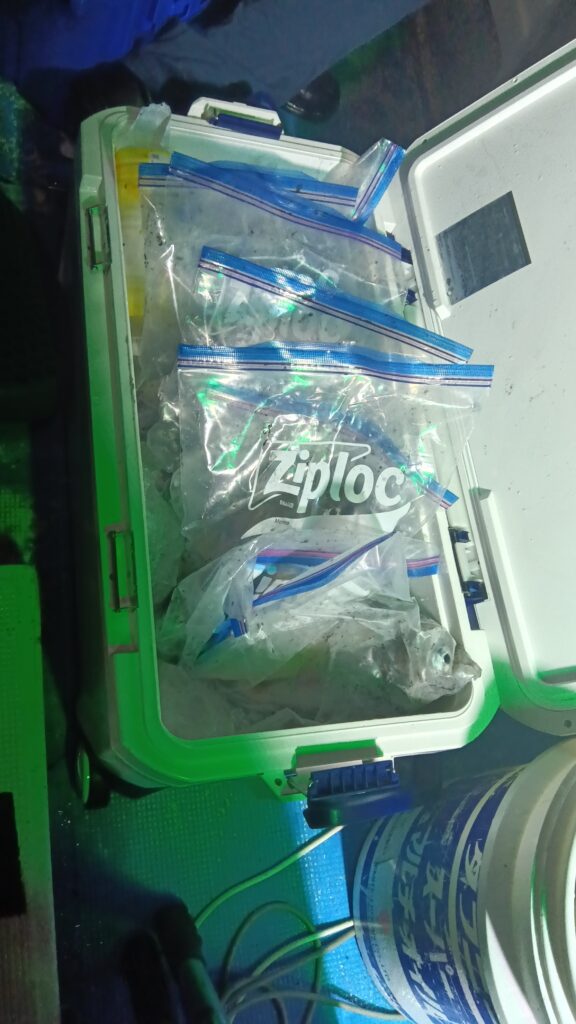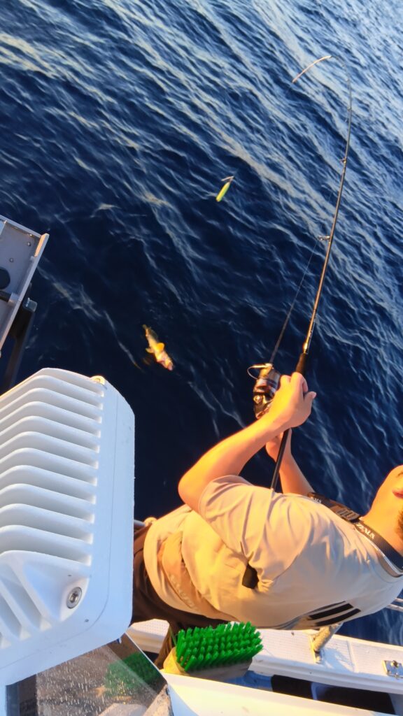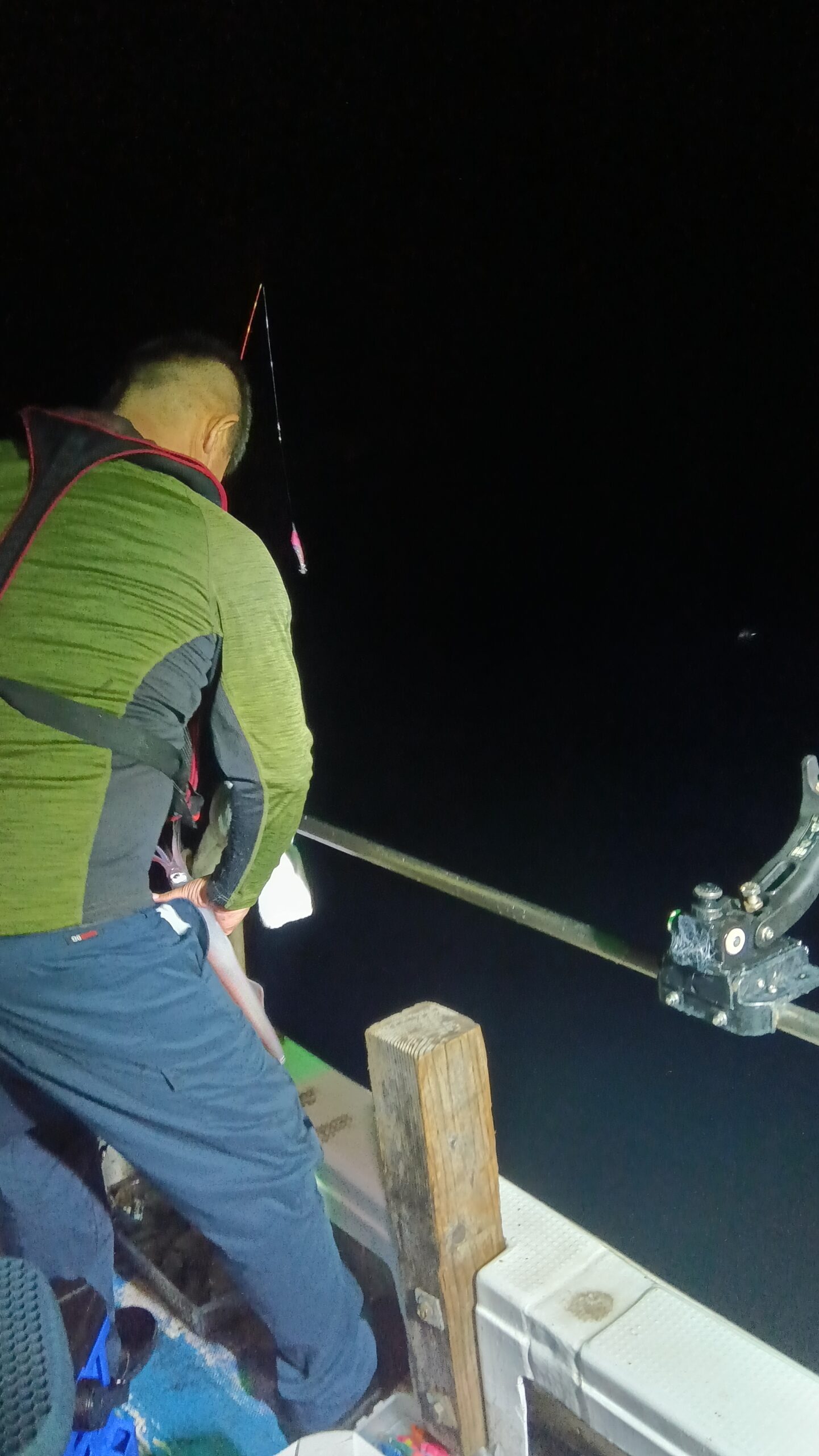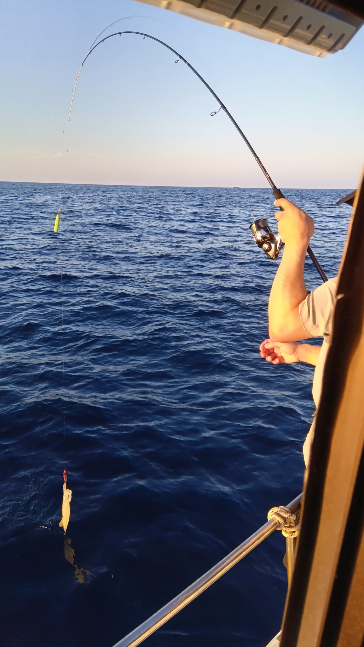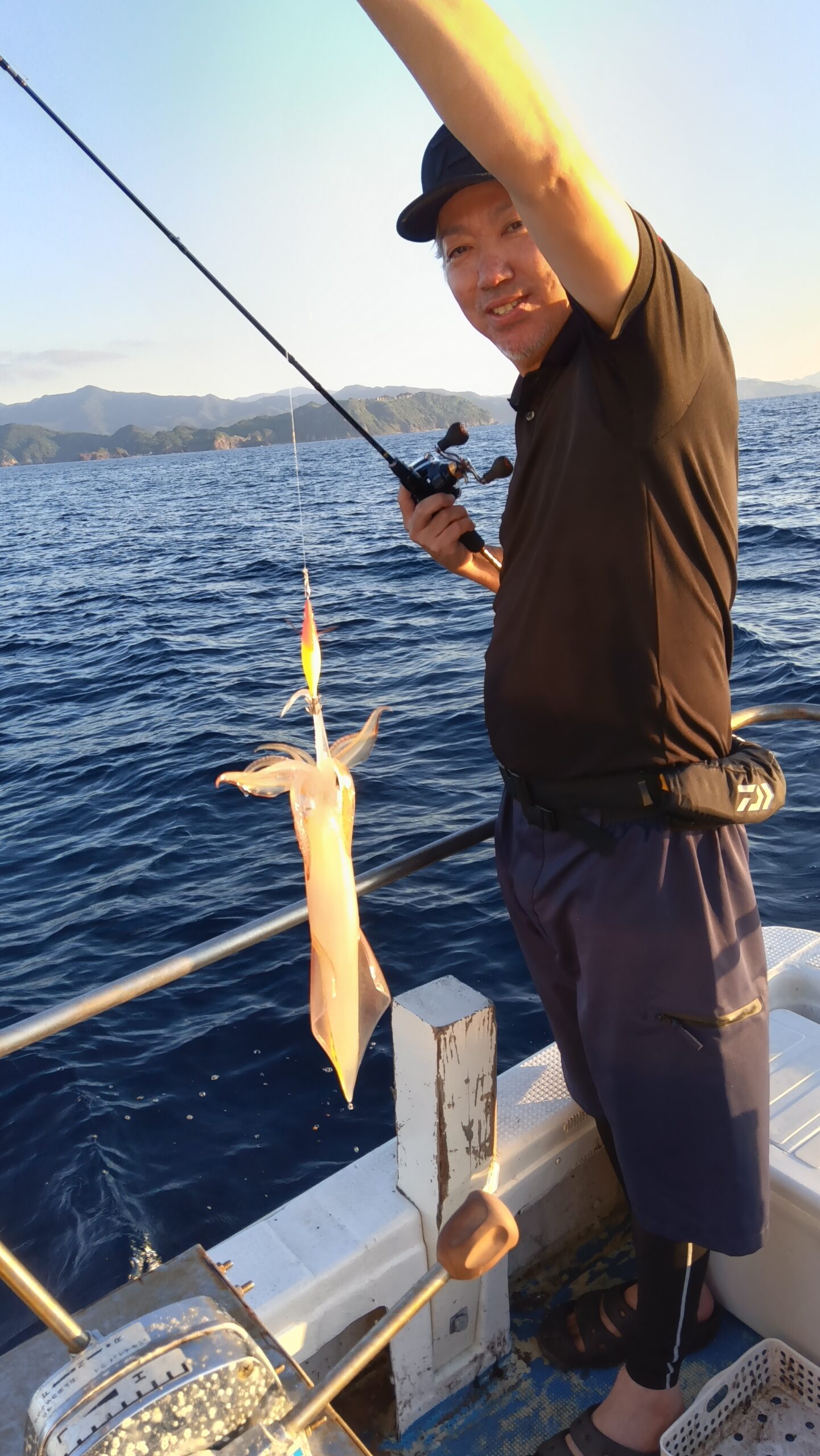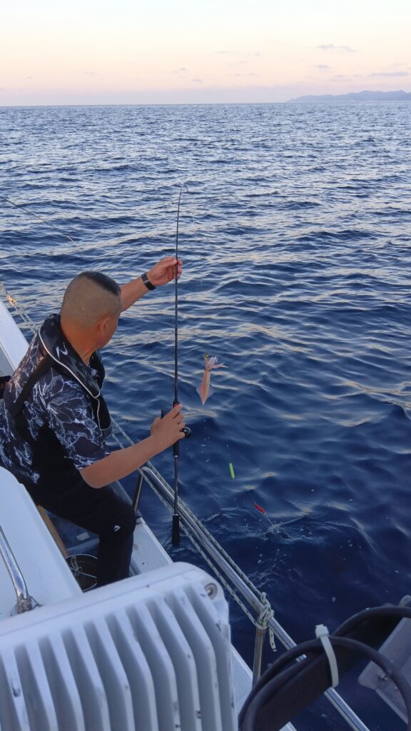 常連さん6名様より出船しました。ポイント到着後まだ夕日が焼けて美しい時間からアタリが続発。若手ホープの竿に一番に上がってきましたのは中剣サイズ白イカでした。船上には歓声と怒号が行き交う賑やかな場面になりましたが何とかあろうことか後ろのボスとお祭りしてました。あたふたしてる間に折角の白イカはポロッと海にお戻りになりました。爆笑の後またまたホープの竿がギュンと曲がり「一番の大物ですよ」と、上がってきたのは30センチサイズのアオハタでまたまた船上は賑やかに。で、また何とお魚ちゃんはさよならも告げずに海にプカプカ漂っていきましたとさ。「タモタモ〜」とホープは夕日に叫んでましたが、時既に遅しで船上は爆笑でした。この経験が若者の今後の釣り人生に生きていく事を祈るばかりです。で、その後肝心のイカ釣の方は集魚灯を点けてからベイトが寄ってきてくれたお陰で今期初のラッシュタイムが続発。トップは大剣中剣サイズ含め65、他の方も平均30前後と皆さん満足していただきました。ご利用いただきありがとうございました。