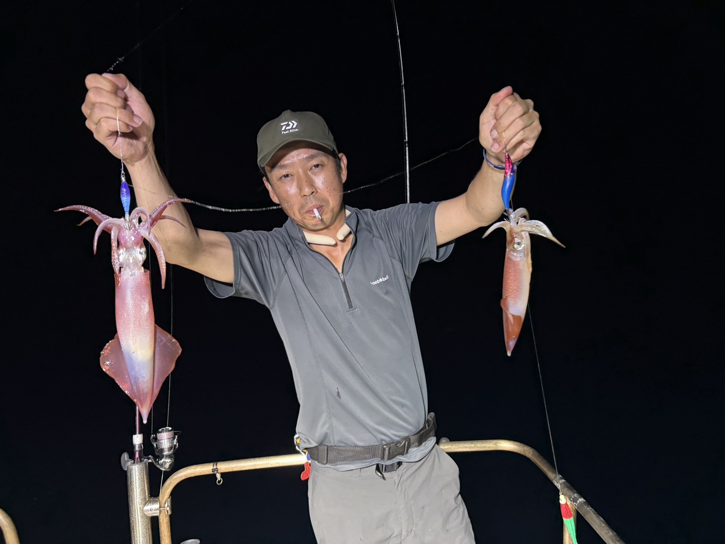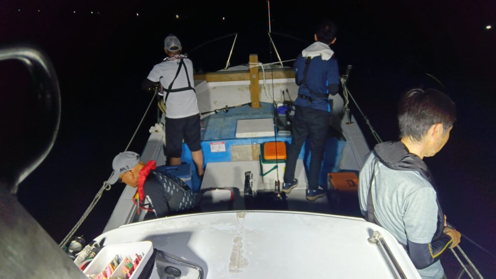 読みは当たったが、がしかし⋯。七人ご乗船いただきありがとうございます。母港笠浦沖は前情報で連日激渋との事だったので、少し遠征しまして東へ舵を切り向かいました。遅出でしたが暗くなると同時に型のいいサイズが上がりだし、大剣中剣サイズがほとんどで途中ラッシュタイムは有り今夜は久々今期初の大漁かと思われた矢先、22時前くらいに僚船船長からそろそろ10m級の数が吹くよって連絡があり、まさかと思ってたらちょっと風が強くなったかと思うと突風が吹き出し、これはいかんとなり泣く泣く母港沖へ戻り再戦しましたが、案の定激渋でそのままタイムアウト。トップは25、全員安打でしたが、サイズが良かったので満足して帰られたお客様もおられました。本日も遠いところご利用いただきありがとうございました。